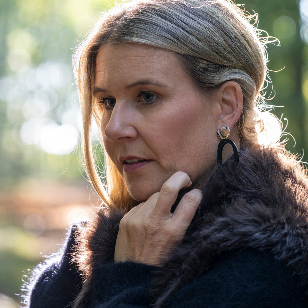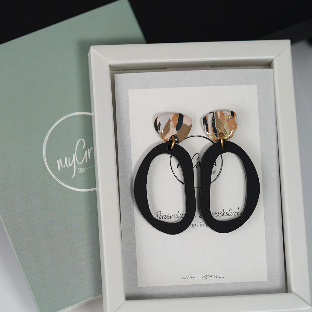 Diese Ohrringe vereinen edles schwarz mit feinen goldenen Akzenten und machen jedes Outfit sofort stilvoll. Das matte Schwarz der Oberfläche trifft auf subtile Gold-Details, die Licht sanft einfangen und dem Look eine luxuriöse Note geben. Perfekt geeignet für gemütliche Herbsttage oder elegante Winterabende – von casual bis festlich, egal ob Büro, Dinner oder Feierabend.