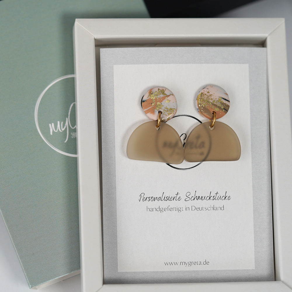 Diese Ohrringe vereinen edles beige mit feinen goldenen Akzenten und machen jedes Outfit sofort stilvoll. Das schimmernde Beige der Oberfläche trifft auf subtile Gold-Details, die Licht sanft einfangen und dem Look eine luxuriöse Note geben. Perfekt geeignet für gemütliche Herbsttage oder elegante Winterabende – von casual bis festlich, egal ob Büro, Dinner oder Feierabend.