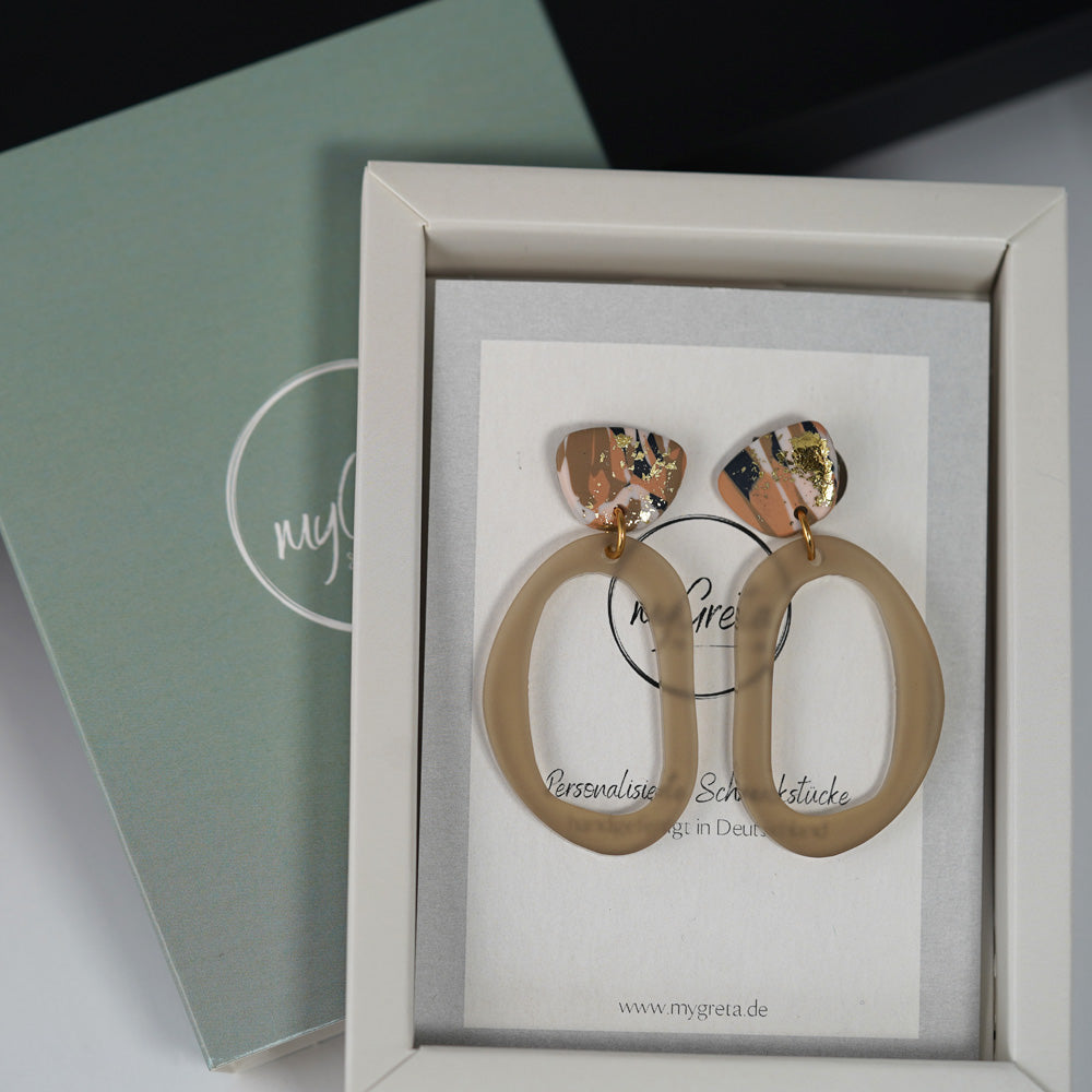 Diese Ohrringe vereinen edles beige mit feinen goldenen Akzenten und machen jedes Outfit sofort stilvoll. Das schimmernde Beige der Oberfläche trifft auf subtile Gold-Details, die Licht sanft einfangen und dem Look eine luxuriöse Note geben. Perfekt geeignet für gemütliche Herbsttage oder elegante Winterabende – von casual bis festlich, egal ob Büro, Dinner oder Feierabend.